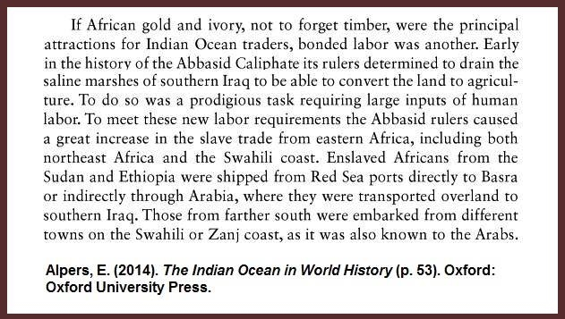 It was under Persian controlled Abbasid khalifate that the chattel enslavement and mass relocation of the Zanj people of East Africa to Iraq took place.
