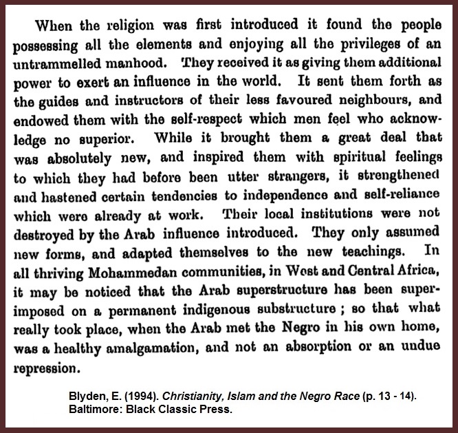 “…[W]hat really took place, when the Arab met the Negro in his own home, was a healthy amalgamation, and not an absorption or an undue repression.” (Blyden 1994, 14)