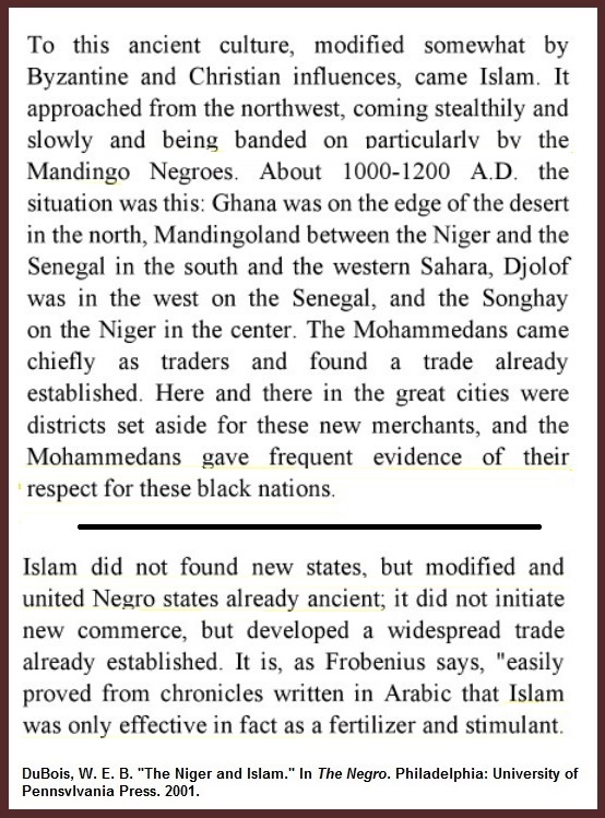 “The Mohammedans came chiefly as traders . . . “, and, “. . . gave frequent evidence of their respect for these black nations. ” (Dubois 2001).