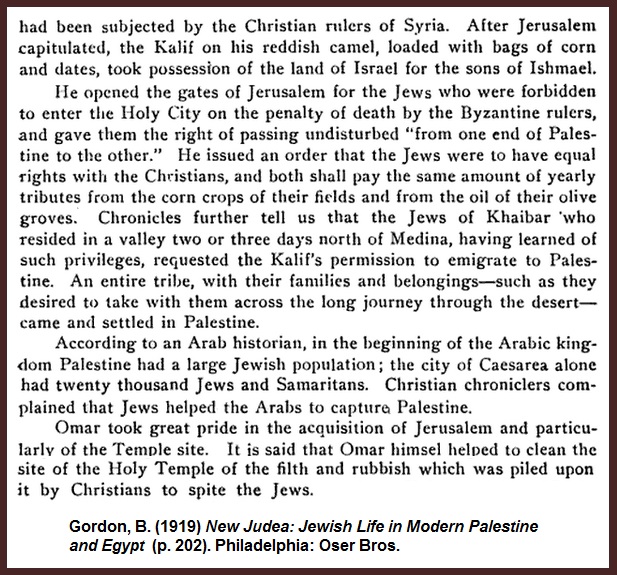 After taking possession of Palestine from the Byzantines, Umayyad khalif Umar ibn al-Khattab opened Jerusalem to the Jews and gave them equal rights with the Christians. He himself helped to clean the Holy Temple of the filth and rubbish piled upon it by Christians to spite the Jews.