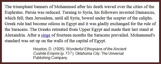 “Greek rule had become odious in Egypt and it was gladly exchanged for the rule of the Saracens.” (Houston 1926, 137)