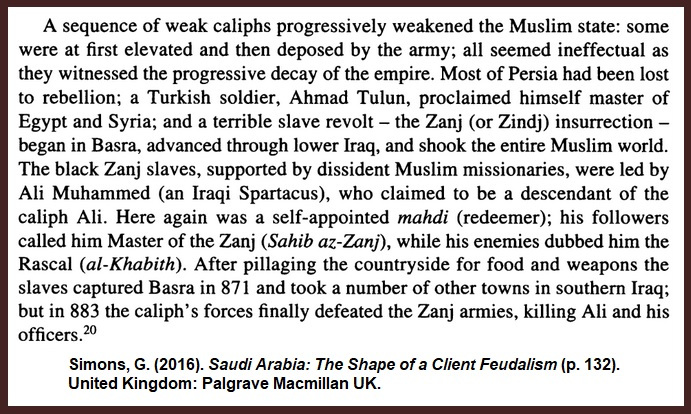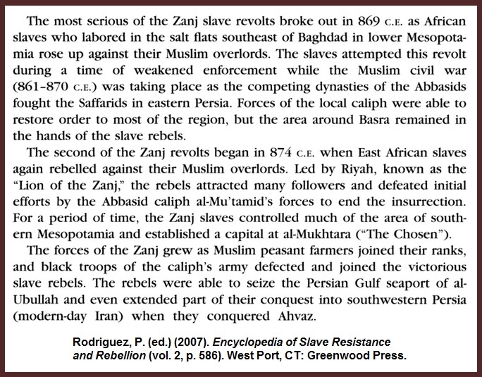 In Baghdad, the enslaved Zanj revolted against their Abbasid oppressors. The Zanj rebels were aided by Muslim peasant farmers and black troops who defected from the Abbasid khalif’s army.